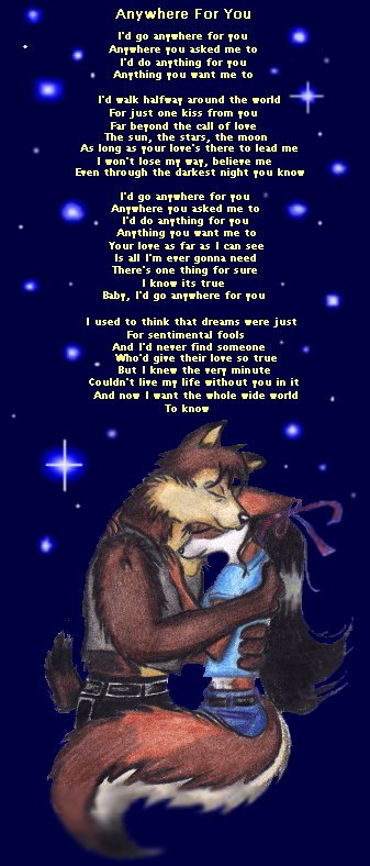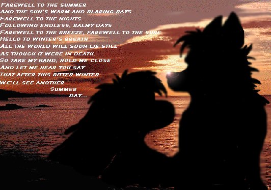 Another summer draws to its end and still the one I love is so very far away. ::sighs:: Oh well. I can wait as long as it takes. I love you, Max. Poem is � me 1999. | ||