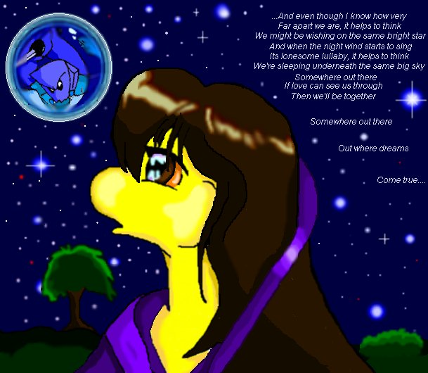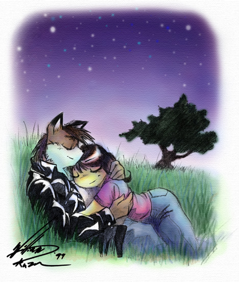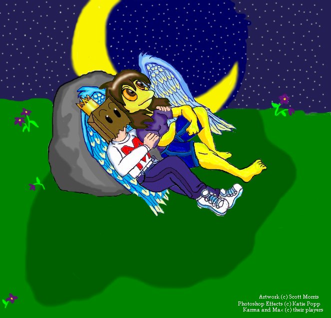 Aww...me and Max are out stargazin' on the cliffs of Starlight Beach. Actually this scene was enacted in MobiusMUCK one evening but Scott drew us like dis anyway ^_^ Oh and as for the wings...yes Karma has wings on occasion but only when I feel like drawin' her with'em. Heh heh...she's Max's little angel ^_~ | ||