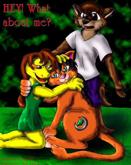 I love this picture. Why do I love this picture? Because this picture is SO adorable, number one, and number two this is one of the few pics that not only shows Max in his paper bag form, but shows off his hyena form all in one. *smiles* Looks like we have a watcher...but ah well. We're...too busy to notice anyhoo =^_^= | ||