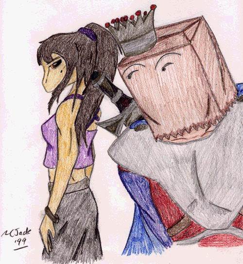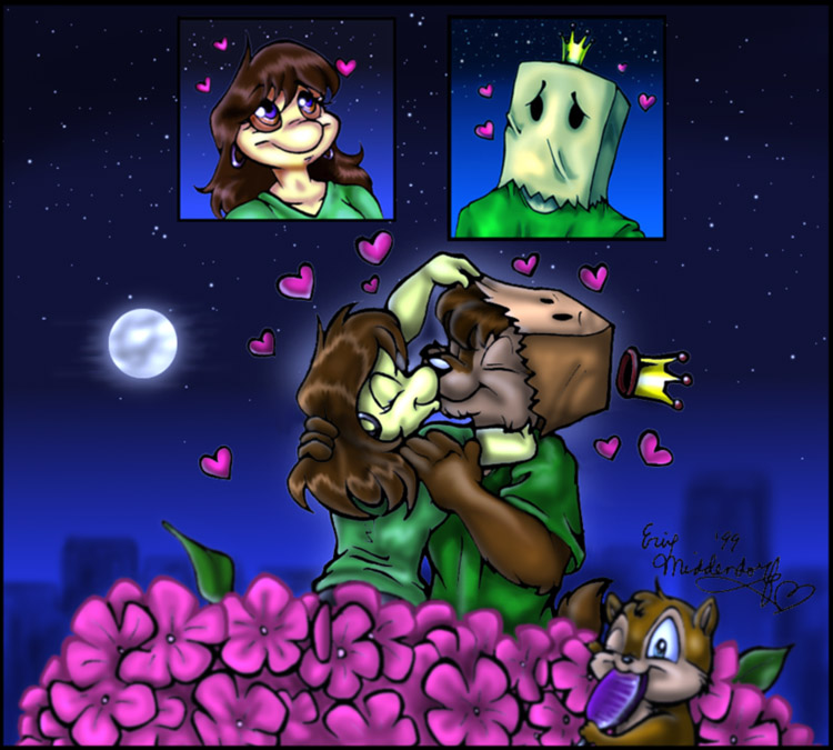*barf* Sorry. Did this one as a Valentines Day gift for Max at the last minute when he surprised me with a really nice pic and all I had given him was a cyber card. I would have posted this earlier except I was still trying to find the uglystick I had beaten this drawing with so I could burn it. Heh heh. The BG's nice, but the characters could've been LOTS better O.o;; All hail the prismacolor pencil >:) | ||