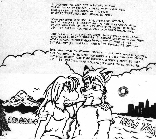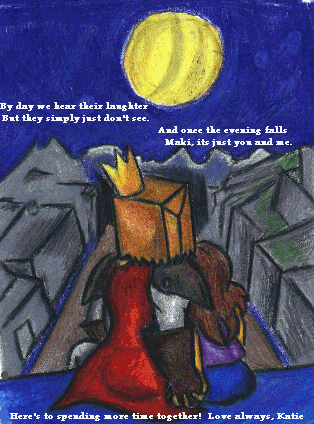 Ahh memories. Back when Max and I had first gotten together, we still weren't really considered a couple. People thought I was on the rebound after escaping from a rather unpleasant relationship and not wanting to be alone. No people, I jus' really liked Max after I got to know him ^_^ Anyway, Max drew this pic as a present to me one night to kinda cement our new relationship. I STILL think its awfully cute :) | ||