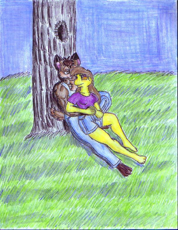 Me? Go overboard for our anniversary? NEVAH!! ^_^ I asked lotsa artists if they'd draw me and Max and actually some of'em said okay. :) One of the first ones I recieved was this REALLY nice pic from Scott of me and Max loungin' under a tree together and looking lovingly at each other. Awwwz, ain't we sweet? >;) | ||