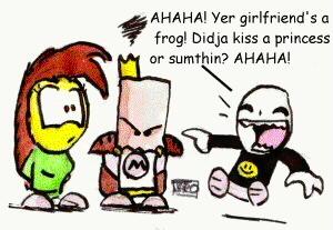 Anudder one by Scott. THIS, 'yotes and 'coons, is why Max and I don't have kids. Looks like ol' Mr. Stork made himself a mix-up and while Max tries to set da problem right, Poor me sits there looking VERY afraid as the little frogling inquires about her parentage | ||
