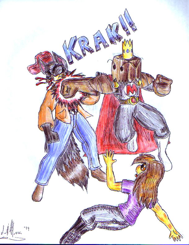 This was drawn as an illustration for my story, "In A Listless World Such As This" at the climax where Max confronts Karma's abusive ex-husband and gets through to him in an "effective" manner that he could treat her better. | ||