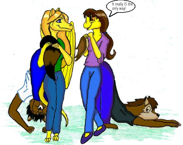 ...my follow-up to Puffy's pic. Max decided it would be nice to even the odds...he's sweet like that. So he took a dose of the Ranma serum too...so now we turn into Amrak and Maxine...anybody got any hot water? -.-;;; | ||